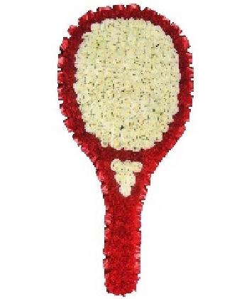 A beautiful tennis racquet shaped tribute made with red carnation with white rose base. A finished with ribbon trimming.