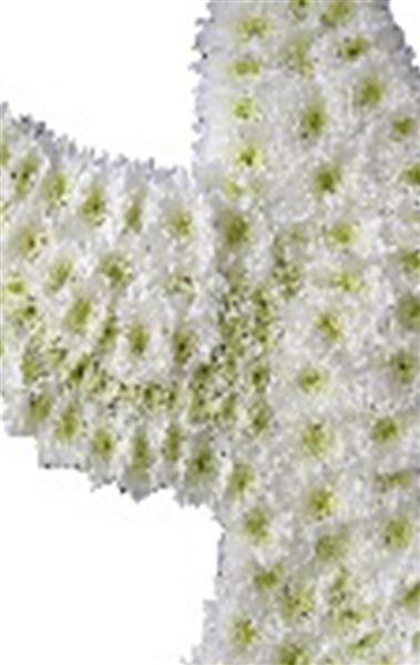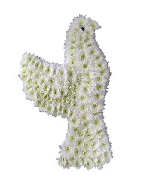 A Beautiful White Dove Tribute cut out made on Oasis floral foam base with chrysanthemums With Ribbon Trimming.