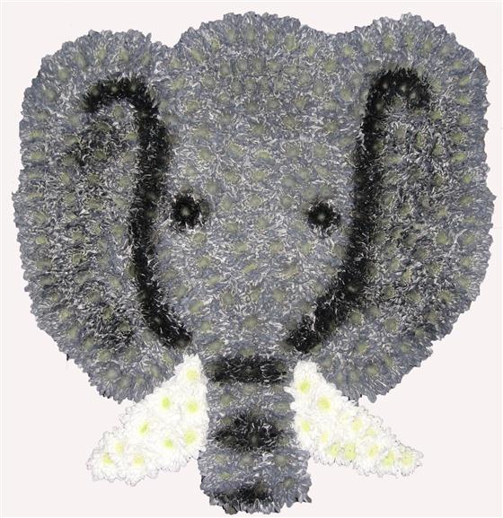 A Beautiful Elephant Tribute Cut Out made on Oasis floral foam base with chrysanthemums and spray with colour. Finished with Ribbon Trimming.