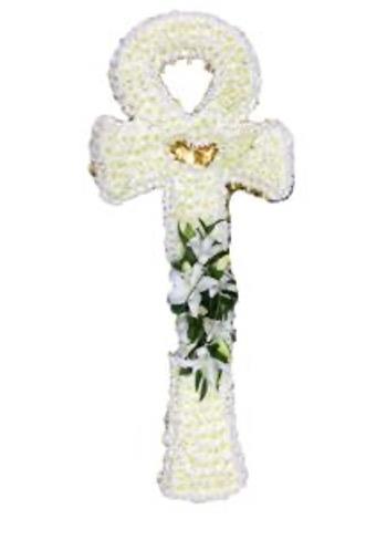 An Egyptian ankh crafted with white chrysants with a vibrant green and white arrangement at the centre.