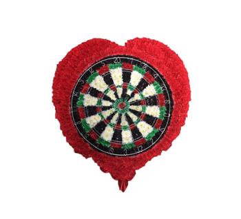 Pay tribute to their love of Dart Board this Beautiful Dart Board Engraved In Middle Of Heart Which Is made with chrysanthemums and sprayed with different colour. Finished with Ribbon Trimming.