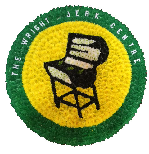 A beautiful Jerk Centre Tribute made on Round Floral foam oasis base with chrysanthemums and spray with colour. Finished With Ribbon trimming.