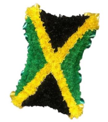 A handcrafted Jamaican flag in the form of a pillow, with vibrantly dyed flowers.