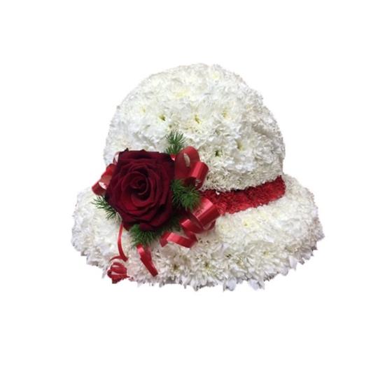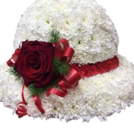A hat made with a Chrysanthemum base, cut to the shaper of your choice. Finsihed with a red rose and ribbon.