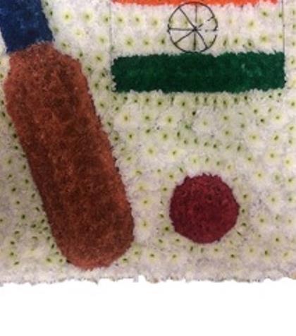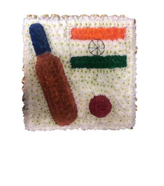 A cricket bat and India flag on a white chrysanthemum base with a ribbon around the edges.