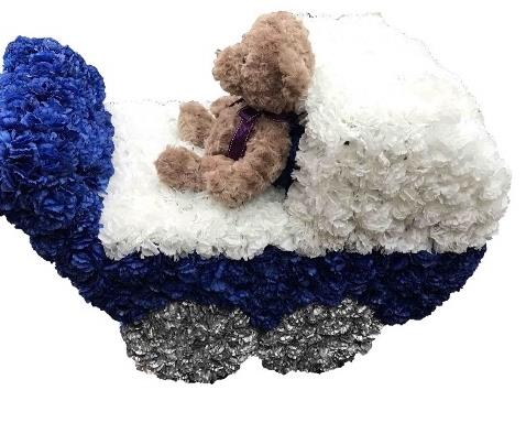 A child's pram made with white and navy artificial flowers with a luxury brown bear placed on top.