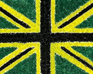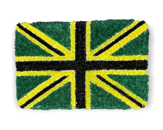A British - Jamaican Flag Tribute flag is made on a large oasis floral foam base with double spray chrysanthemums, spray with colours, and trimmed with ribbon.