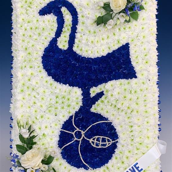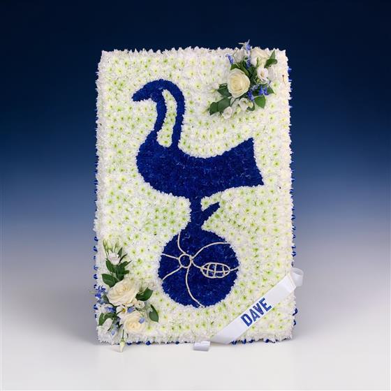 Design sheet engraved with your chosen Tottenham logo. It is made with a chrysanthemum base and finished with a ribbon. Size: 3ft x 2ft.