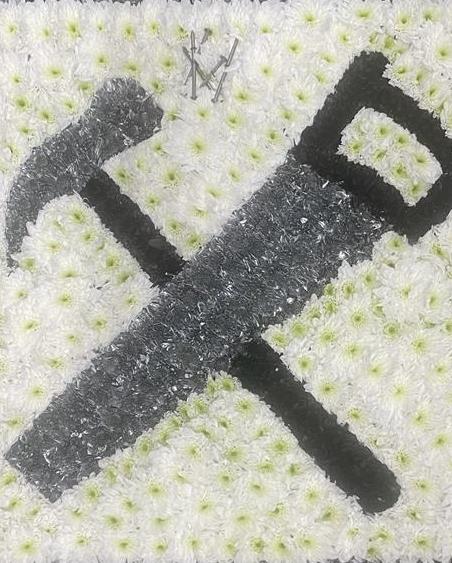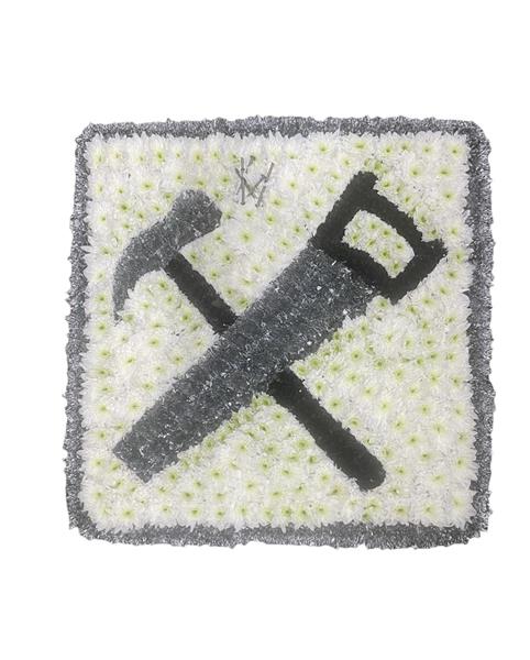 Hammer and Saw Tribute base made with Chrysanthemum & ribbon trimming.