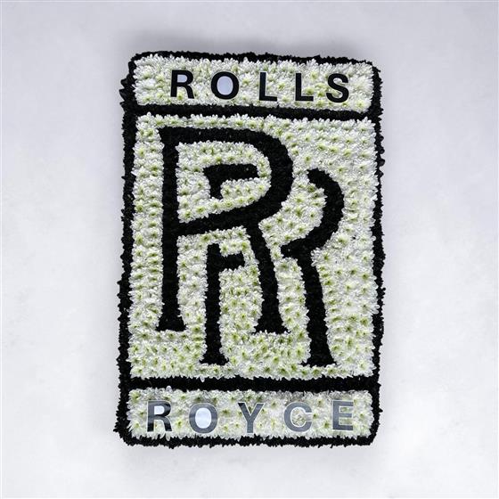 A beautiful Rolls Royce tribute made from white chrysanthemums, dyed black to engrave the logo design, finished with a black ribbon.