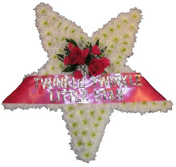 A 5 point star made with spray Chrysanthemum and small arrangement in the middle.