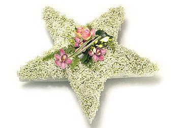 Based wreath of white Gypsophila with pink Orchid spray with complementary foliage and ribbon edging.
