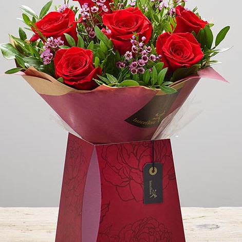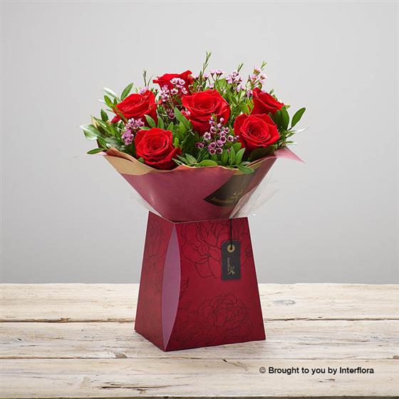 Featuring red large headed roses and pink waxflower with pistache and salal, presented in a burgundy sketch gift box