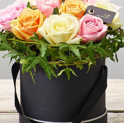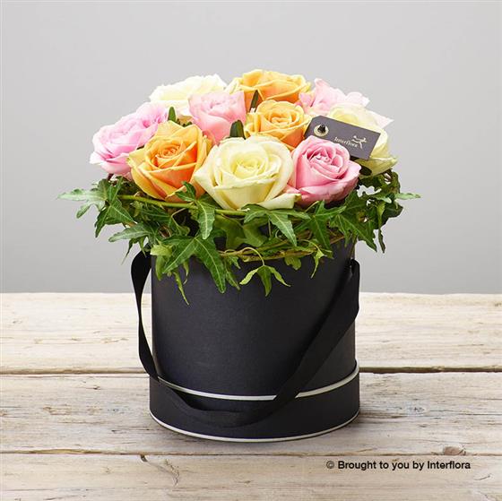 Featuring peach, pink and ivory large headed roses with variegated ivy and pistache, presented in a tall black and cream hatbox