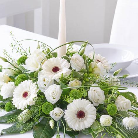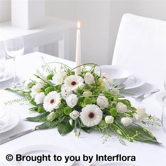 Germini, lisianthus and fragrant freesia, all in pristine white, combine to create this classic yet timeless centrepiece. A tall, elegant candle makes a charming finishing touch.