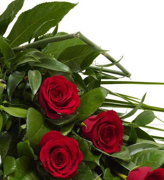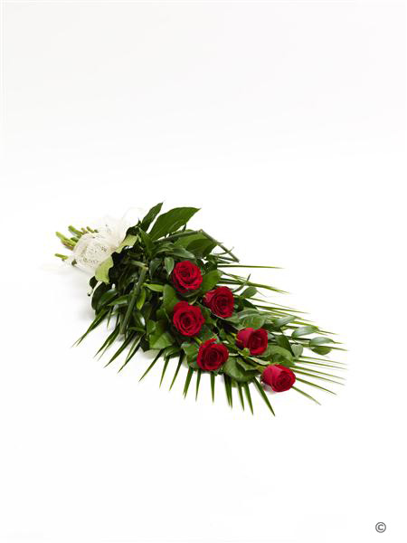 6 large-headed red roses are presented with aralia leaves, French ruscus and eucalyptus to create this simple, classic rose sheaf.