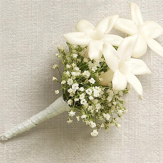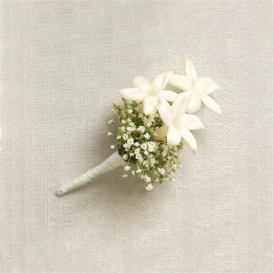 Featuring 3 stephanotis blooms with Million Star gypsophila finished with ivory satin ribbon. This buttonhole is approximately 8cm (w) by 13cm (l).