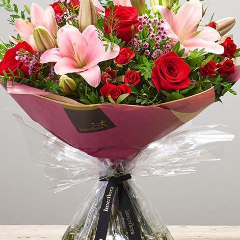Featuring red large headed roses, pink LA lilies, red spray roses and pink waxflower with salal, pistache and eucalyptus, hand-tied, wrapped and presented in Interflora gift packaging