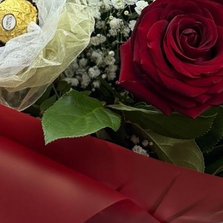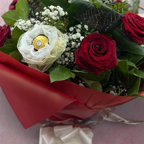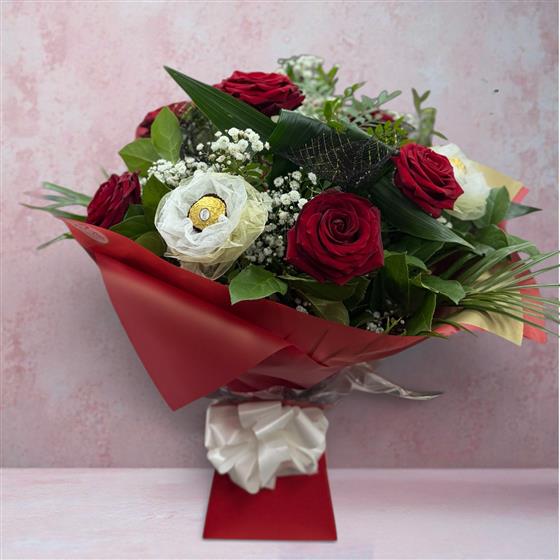 Indulge in a perfect blend of romance and sweetness with our Ferrero Rose Luxe Bouquet. This elegant arrangement combines rich red roses, delicate gypsophila, and fresh greenery, beautifully complemented by individually wrapped Ferrero Rocher chocolates arranged like floral blooms.