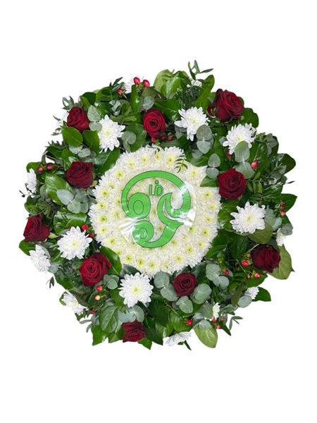 A red, green, and white posy pad elegantly crafted with a red Tamil Aum at the center.