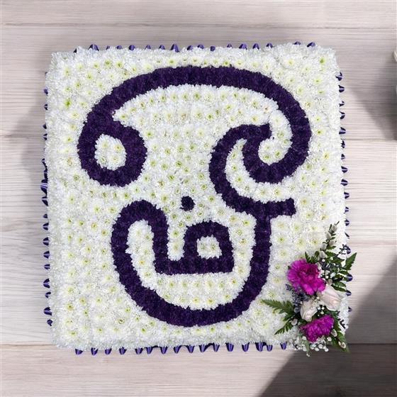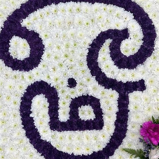 A large base with TAMIL AUM symbol made with Chrysants. Beautiful arranged with your choice of ribbon trimming colour arround the base.