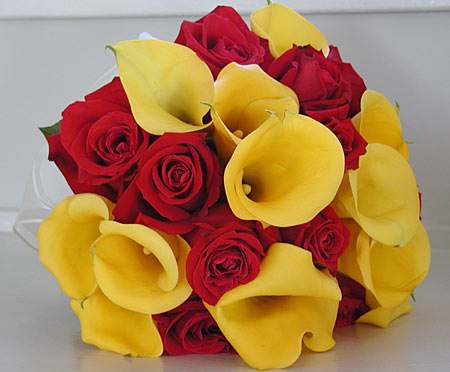 Fabulous deep yellow Calla Lily along with red roses have been studded with crystal for a bouquet with subtle glamour.