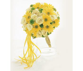 Luxurious Cream roses with fresh green and yellow chrysanthemum. A multi colour design beautifully accessorised with pearls. Stems bound with bridal holder.