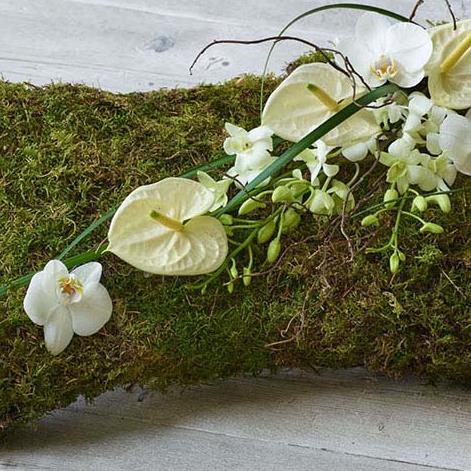 A stunning pillow design of orchids, anthuriums, grass, natural willow and lily grass, all set on an eco-friendly moss base.