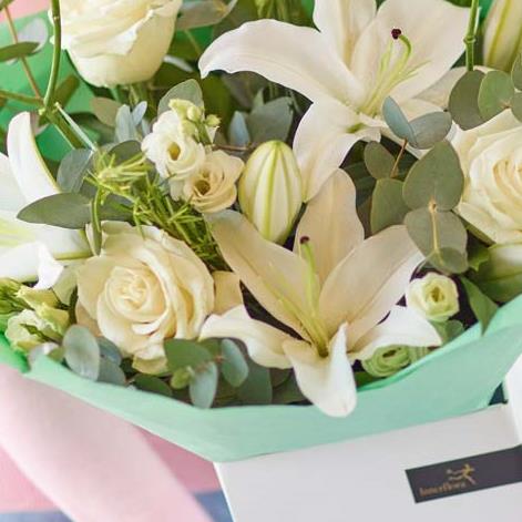 Fresh white roses and elegant white lilies are the stars of the show here. Their local florist will nestle them in amongst gorgeous foliage and other beautiful co-ordinating blooms, in an elegant bouquet, made just for them.