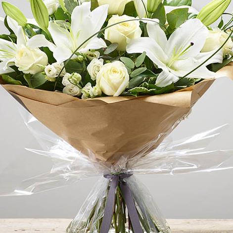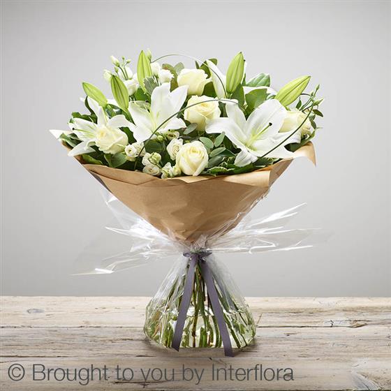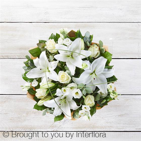 Featuring white large headed roses, with white Oriental lilies and white lisianthus hand-tied with steel grass, salal, eucalyptus and pittosporum, hand-tied, gift-wrapped and presented in Interflora gift packaging.