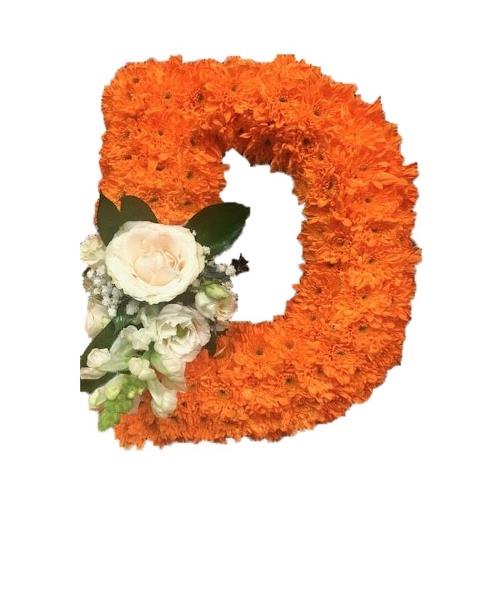 Made with a chrysant base, with a small arrangement, Available in any name or relation in floral letters A to Z or 1 to 0 (maximum 8 character per tribute)Please select dyed colour & select the Name required.